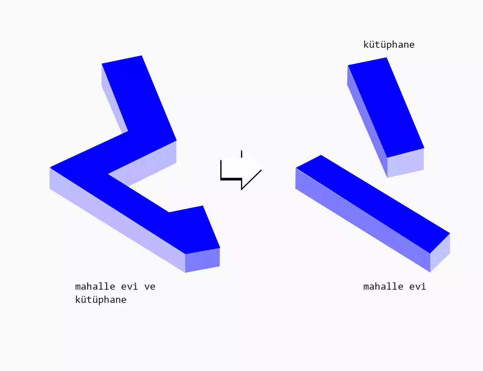 Buna bir de yarışma programındaki süreçte mahalle evi biriminin ihtiyaç programında fazlaca birime ayrılmış halde istenmesi, tek bir müdürlüğün bu karmaşıklıktaki bir organizasyonu yönetememesi yani ihtiyaç programının yeterince iyi hazırlanmamış olması ekleniyor. Mahalle evi içinde yer alması planlanan kütüphane fonksiyonunun, mevcut haliyle tek bir işletme altında sürdürülebilir olmayacağını; daha bağımsız, hatta ayrı bir müdürlük olarak ele alınmasının daha doğru olacağını konuşuyoruz. Bu karar, aslında yapının işletme modelini de değiştiriyor. Tek bir yapı, tek bir kullanıcı yerine; bir arada var olacak dört farklı işletmeci / müdürlük fikrini ortaya çıkarıyor.