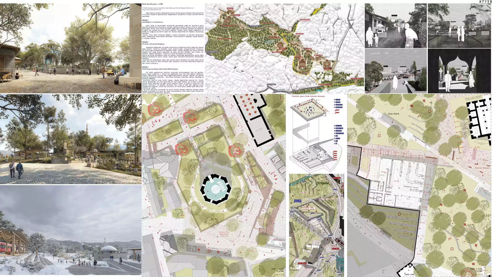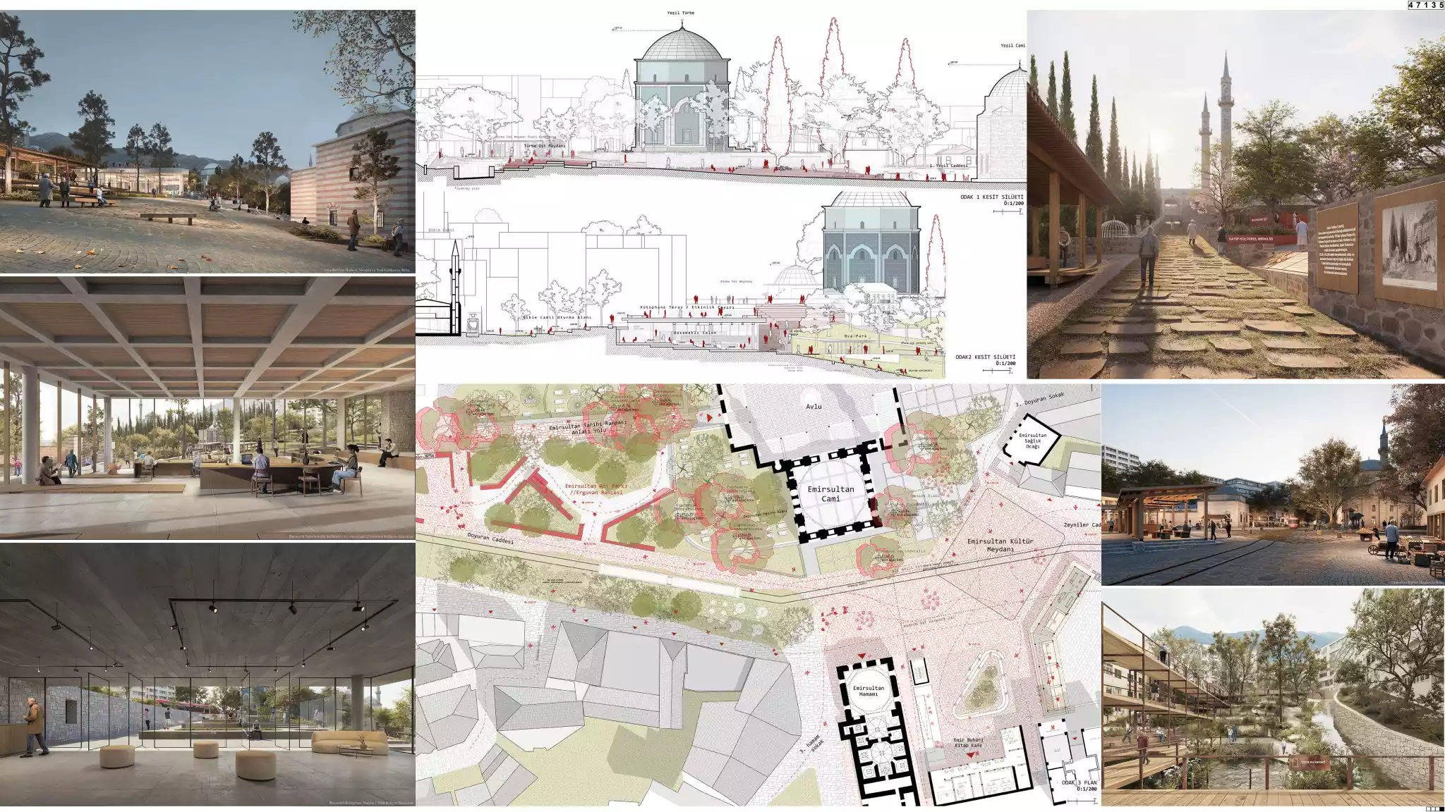 Emirsultan Külliyesi çevresinde ise mevcut kentsel dönüşüm nedeniyle ölçekten kopmuş boşluğu tanımlamak için ahşap bir saçak tasarlayarak bu alanı daha insani ölçekte bir kültür meydanına dönüştürmeyi amaçladık.