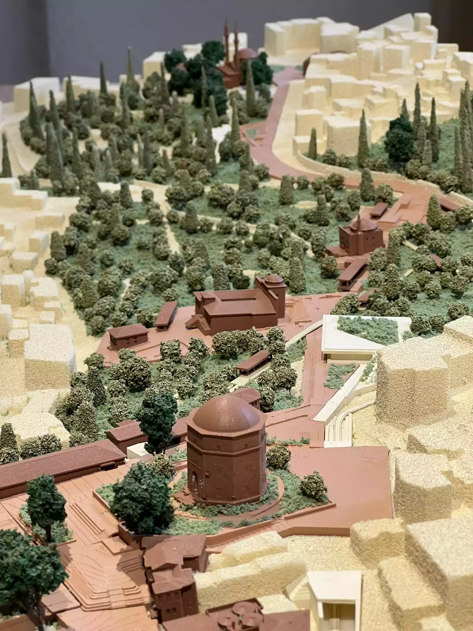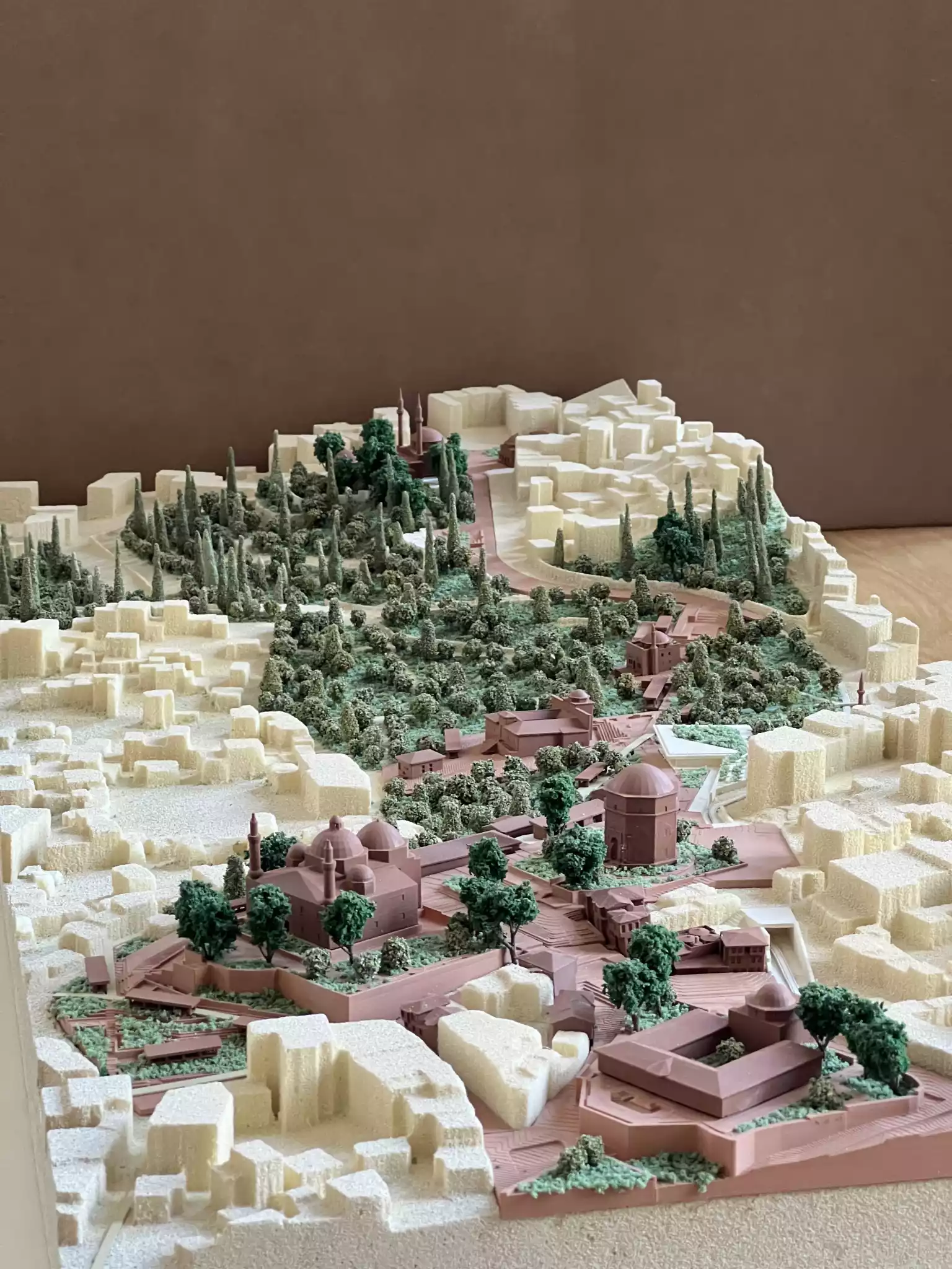 Emirsultan Camii’ne çıkan tarihi rampayı, döşeme değişikliği önererek bir “anlatı yolu”na dönüştürdük. Bu yolun kenarında yer alan üçgen alanda, yol açılması sırasında yıkılan Cezeri Medresesi ve diğer tarihi yapıların duvar ve izlerini içeren bir “anı bahçesi” tasarladık. Bu bahçede, mevsimsel renk, vurgu ve hafif koku sağlayan Cercis siliquastrum (Erguvan), Cornus mas (Kızılcık) ve Prunus dulcis (Badem) gibi temsil bitkilerine yer verdik.