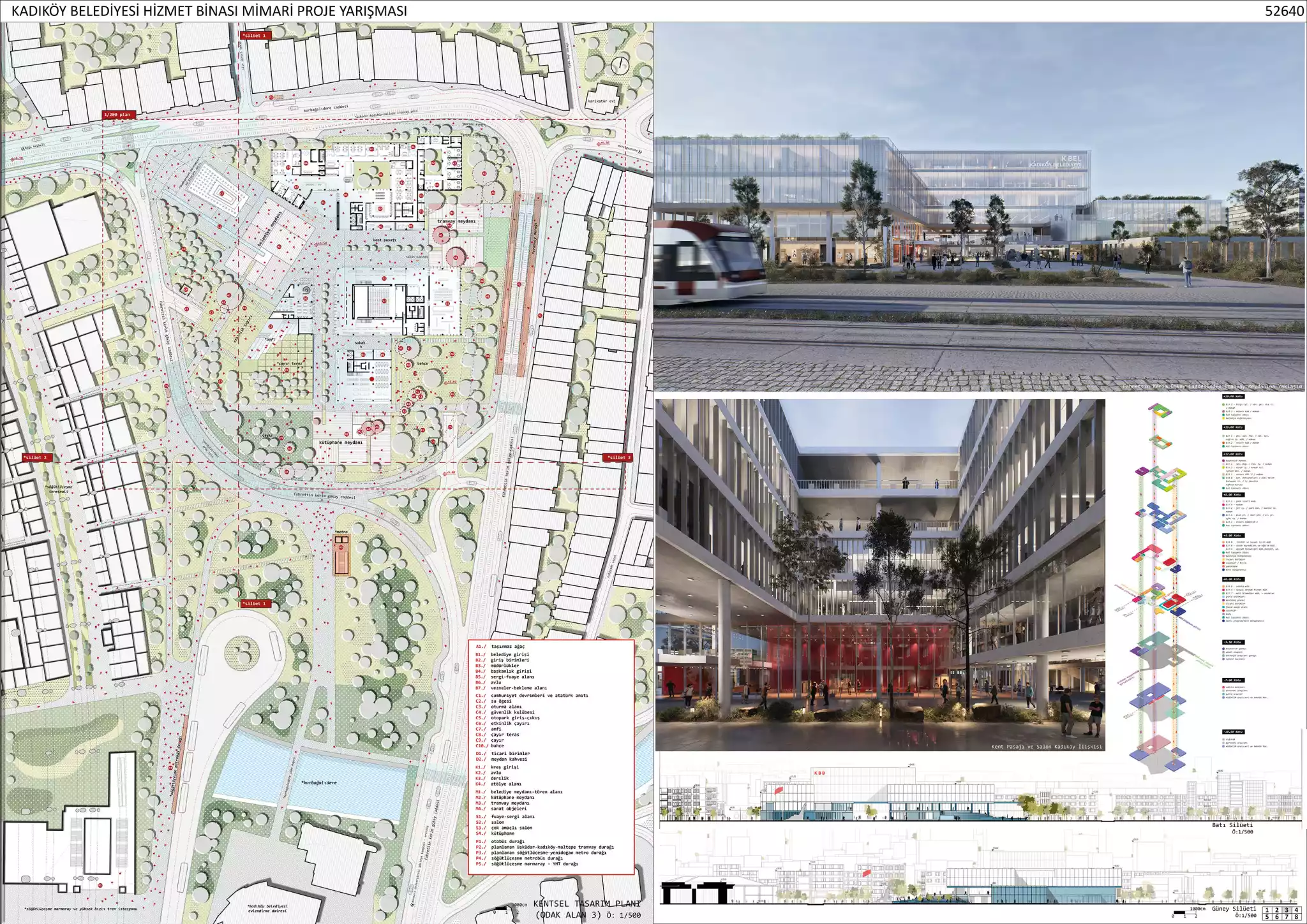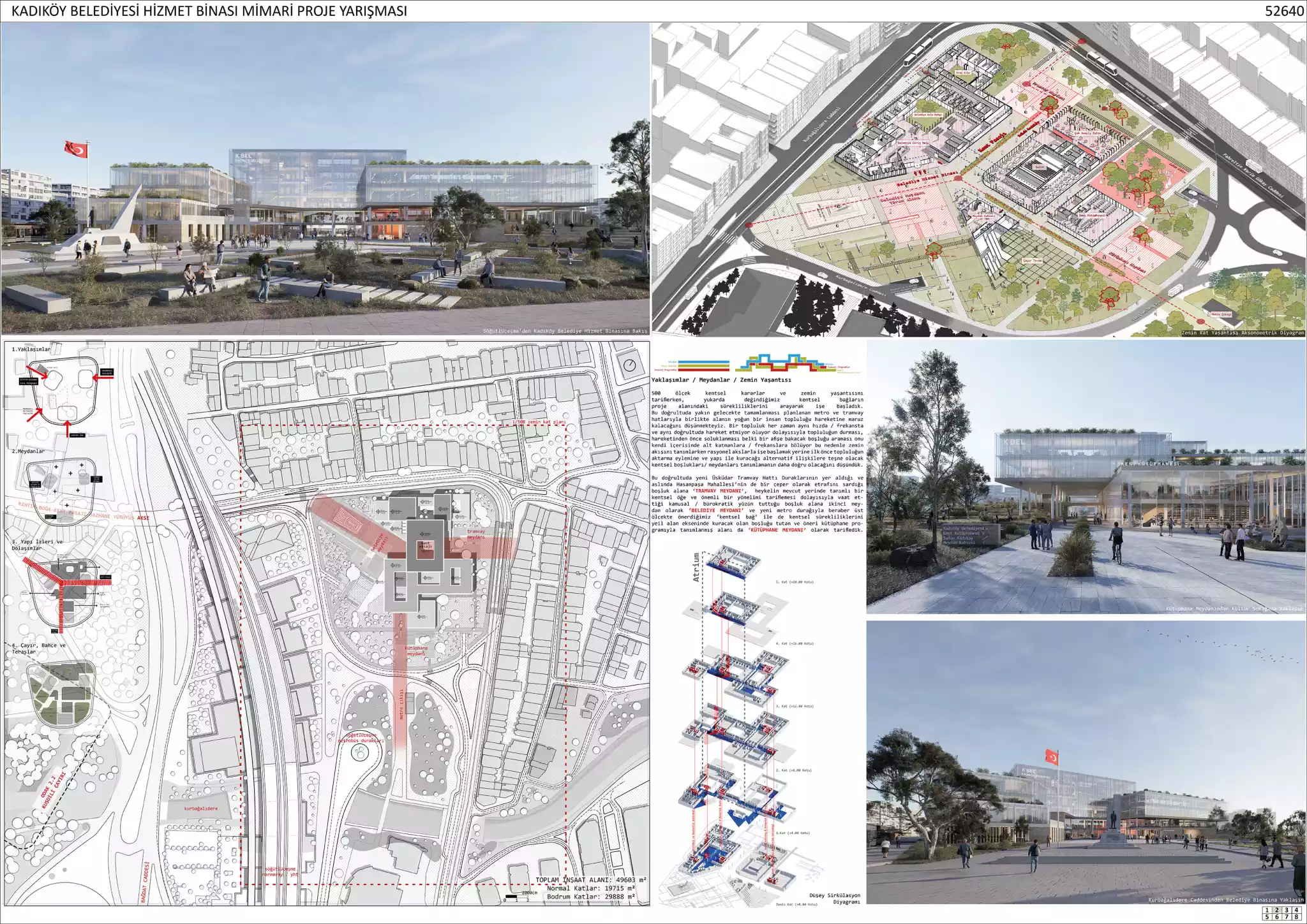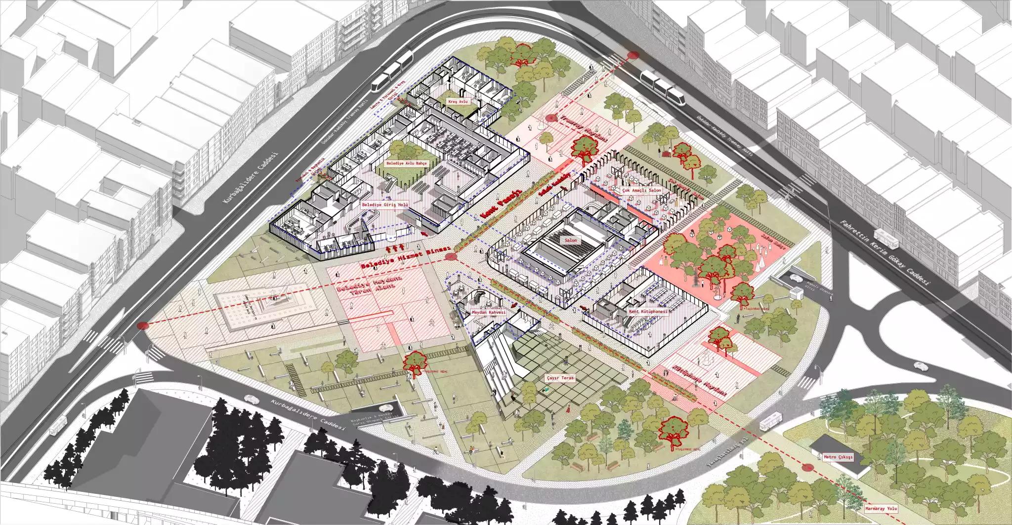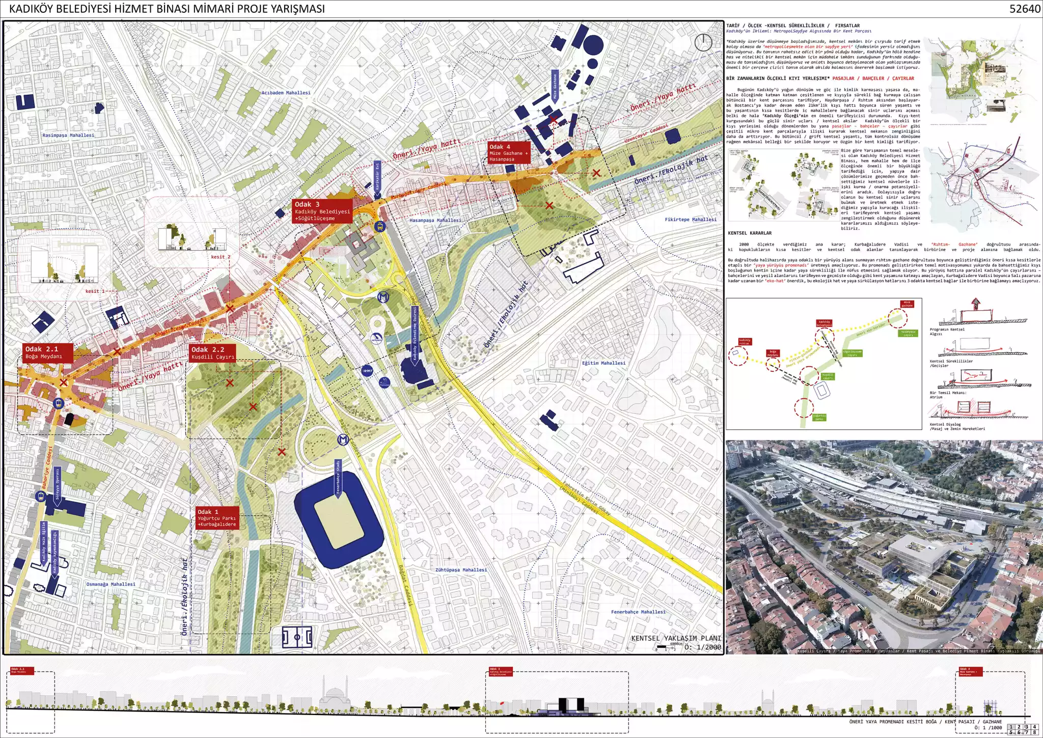 Kadıköy Belediyesi Hizmet Binası, hem mahalle hem de ilçe ölçeğinde önemli bir büyüklüğü tariflediği için, yapıya dair çözümlerimize geçmeden önce bahsettiğimiz kentsel nüvelerle ilişki kurma / onarma potansiyellerini aradık. Dolayısıyla doğru olanın bu kentsel sinir uçlarını bulmak ve önereceğimiz yapıyla kuracağı ilişkileri tarifleyerek kentsel yaşamı zenginleştirmek olduğunu düşünerek kararlarımızı aldığımızı söyleyebiliriz.