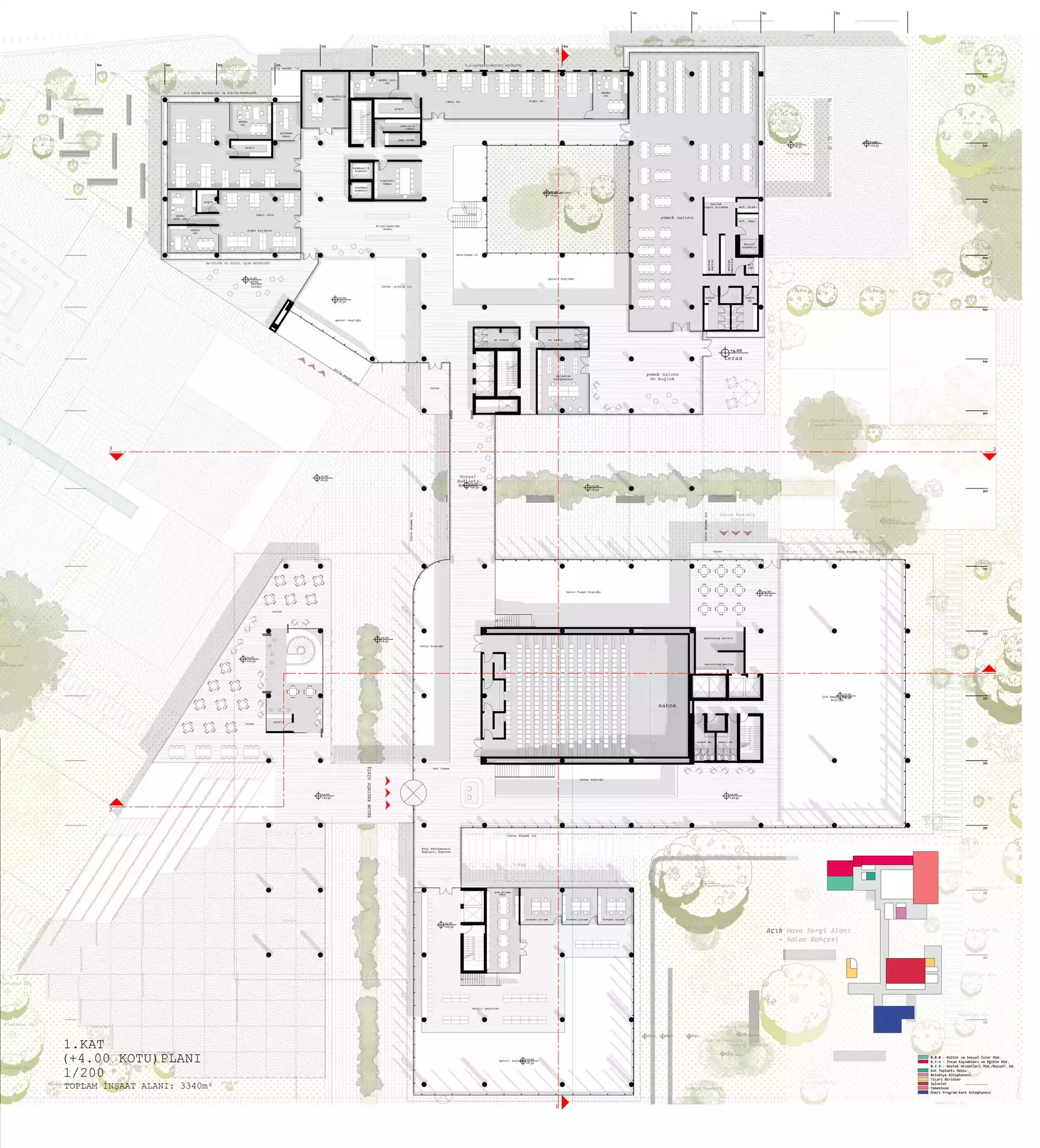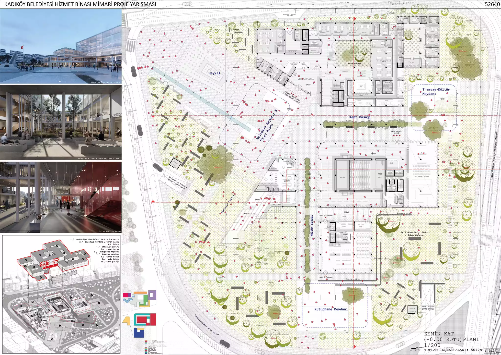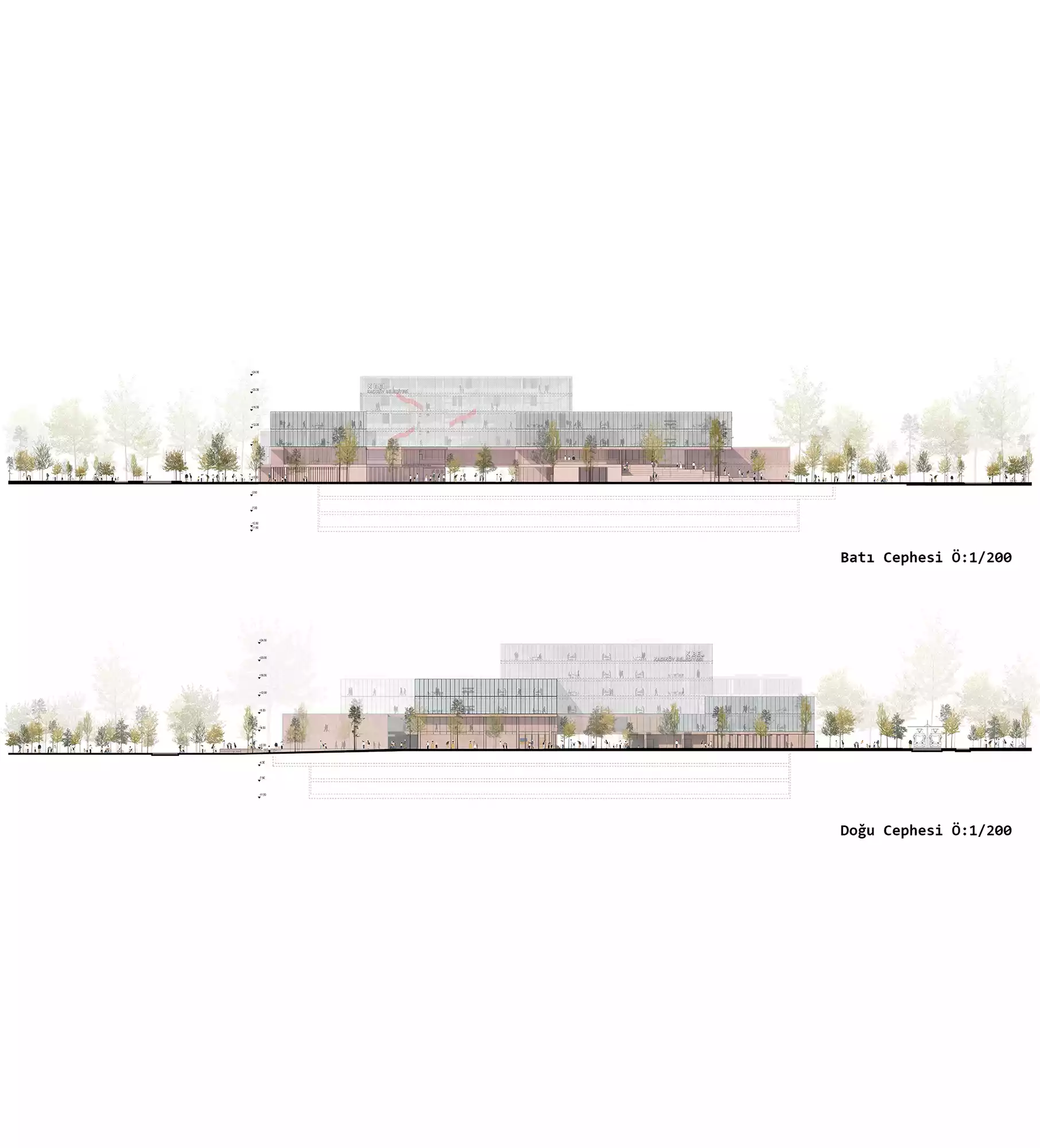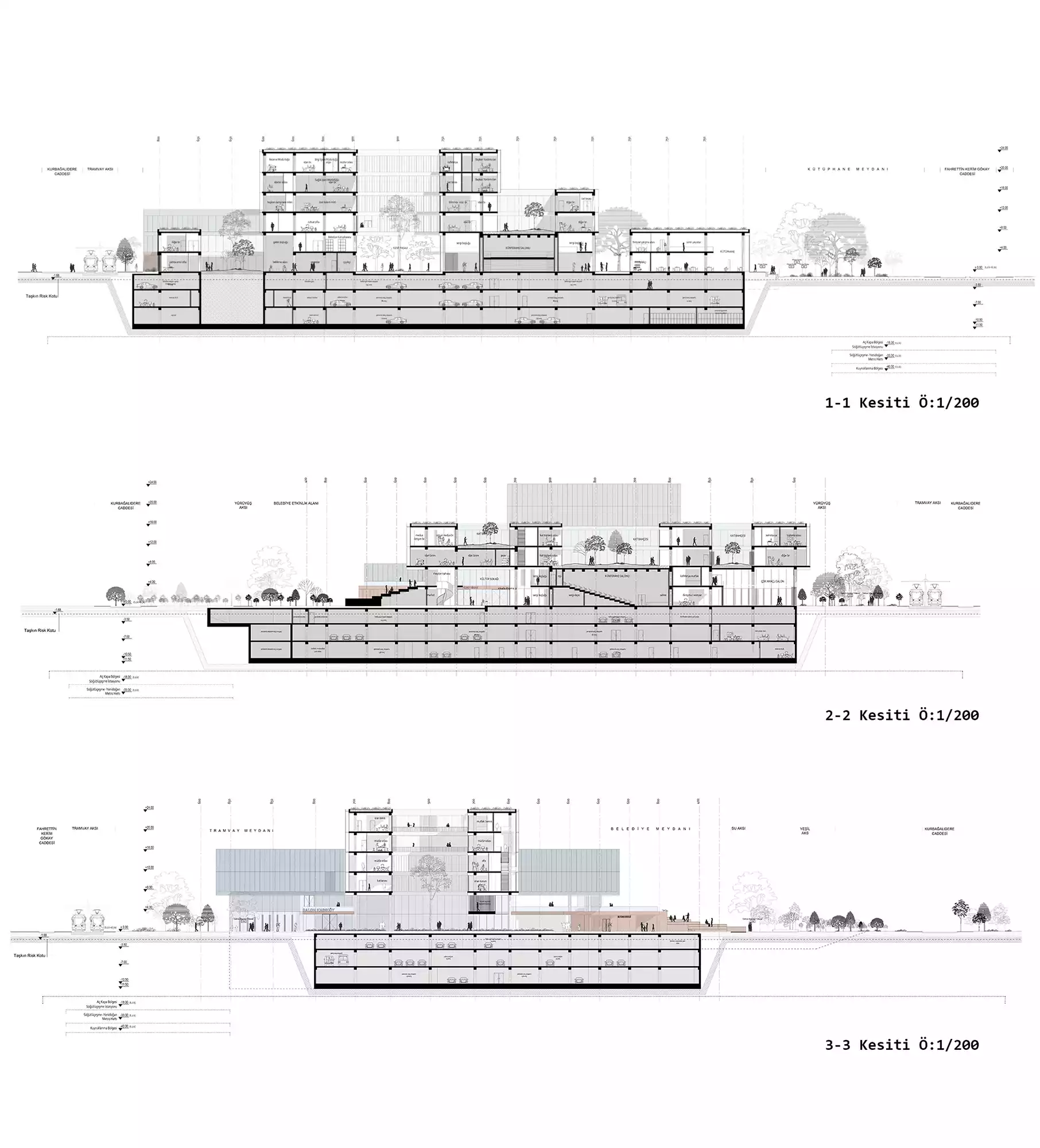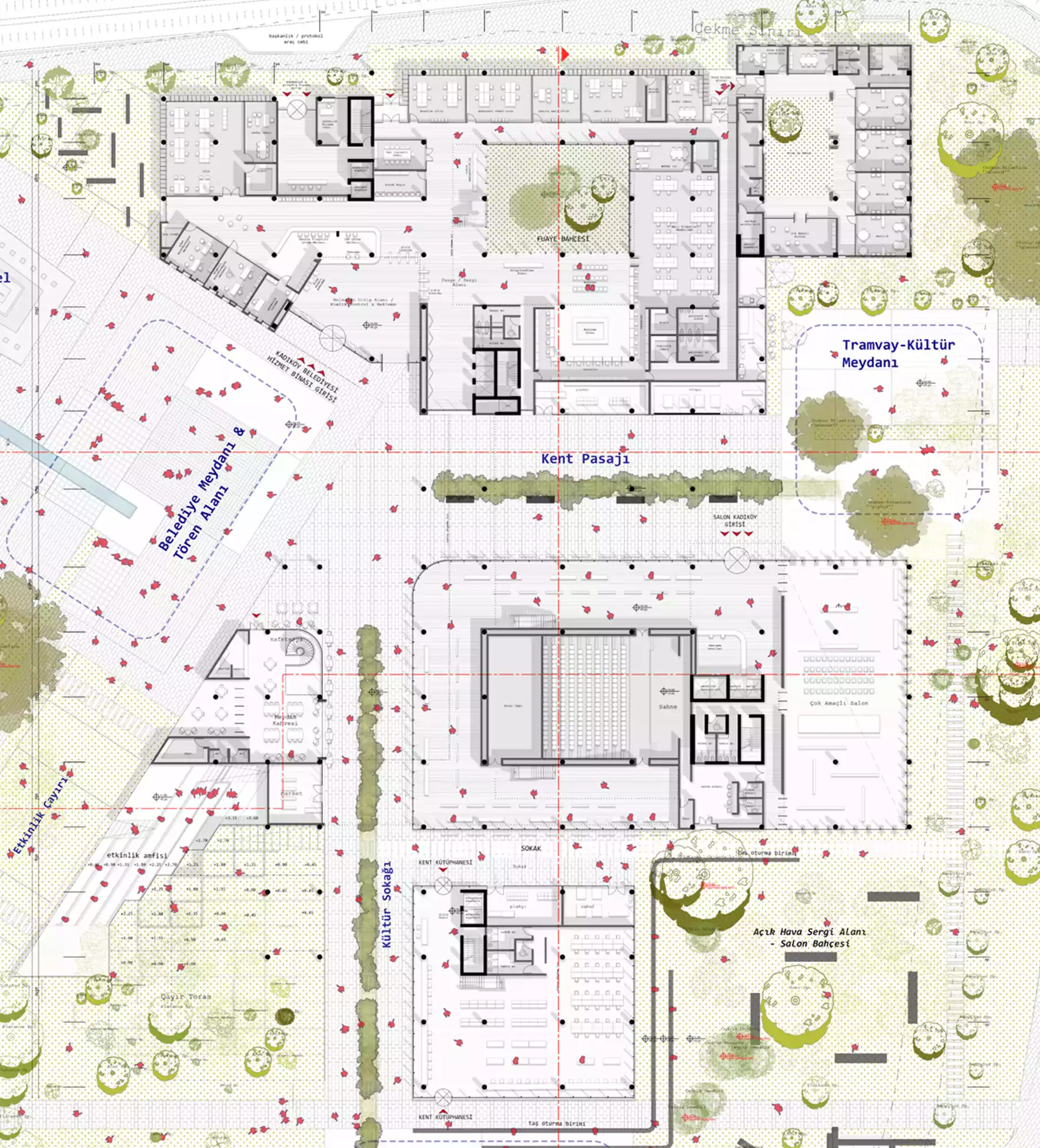 Kent Pasajı: Belediye Meydanı’nı Tramvay Meydanı’na bağlayan bu kentsel geçiş alanı, aynı zamanda yapı programını zemin katta bölerek yönetim birimleri ile salonları ayrı mekânlar olarak birbirleriyle ve kentle etkileşime açmayı amaçlıyor. Bu geçiş alanının üst ölçek kararlarımız olan Rıhtım-Gazhane promenadı ile sıkı bir kentsel bağ kuracağını düşünüyoruz.